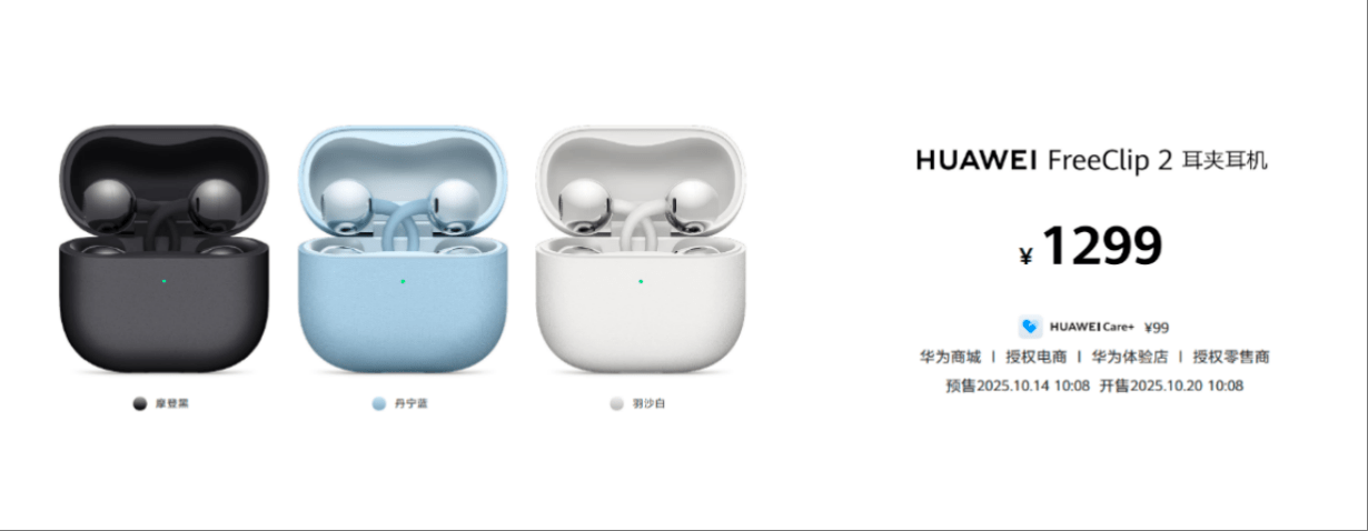 华为FreeClip 2耳夹耳机2025年10月14日10:08开启预售,10月20日10:08正式开售,首发价格1299元,用户可登陆华为商城及各大授权电商平台或前往华为体验店、华为授权零售门店进行购买。(崔玉贤)