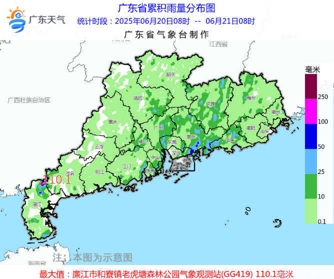 20日白天到21日早晨,我省多云间阴天,出现了分散(雷)阵雨,局部大雨或暴雨。据气象水文监测,06月20日08时到06月21日08时,全省平均雨量6.1毫米,有1个镇街录得超过100毫米的大暴雨,有18个镇街录得50毫米~100毫米的暴雨,有126个镇街录得25毫米~50毫米的大雨,各市雨量最大的镇街有:湛江廉江市和寮镇110.1毫米、深圳大鹏新区葵涌办81.9毫米、茂名化州市文楼镇75.5毫米等。