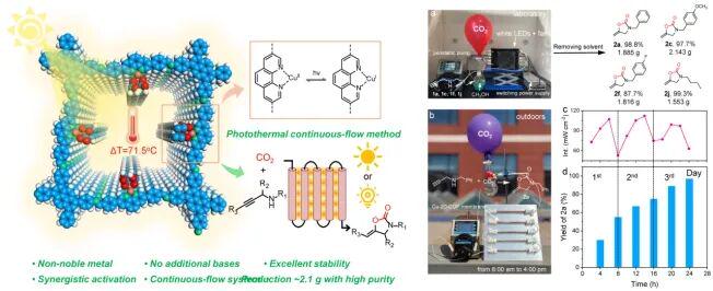 共价有机框架(covalent organic frameworks, COFs)是一类具有明确晶态结构的多孔有机聚合物,其内部具备尺寸均匀、排列有序的孔道系统,在气体存储与分离、催化以及光电材料等领域展现出广泛的应用前景。近年来,由于其高度共轭的骨架结构和优异的光响应特性,COF材料在光催化研究中受到广泛关注。拓扑结构对其光催化性能具有决定性影响,然而,催化活性位点处存在的维度依赖性电荷极化行为与其催化性能之间的构效关系,目前仍未得到深入揭示。基于此,研究团队通过精准构建具有不同维度特征(二维与一维)的菲啰啉基COF材料,提出了一种基于维度工程的微环境调控策略,实现了对铜活性中心局部电子与空间结构的定向优化。综合系统表征与理论计算结果表明:二维COF因其分子骨架的柔性与高度有序的介孔通道,不仅促进了光生载流子的非辐射跃迁,还显著提升了反应物的传质效率;同时,其层状堆叠结构通过光热协同效应动态调控Cuδ+(1≤δ≤2)的电子态,从而协同增强底物的吸附与活化过程。在可见光照射及无碱条件下,该二维铜基COF在催化炔丙胺与CO2的羧化环化反应中实现了接近99.9%的产物收率。基于其优异催化性能,研究团队进一步开发了连续流光催化反应系统,该系统表现出优良稳定性并成功合成出2.143克药物级2-噁唑烷酮产品,纯度超过95%。本研究不仅揭示了维度工程在调控催化微环境中的关键机制,也为设计连续高性能CO2催化转化提供了新思路。